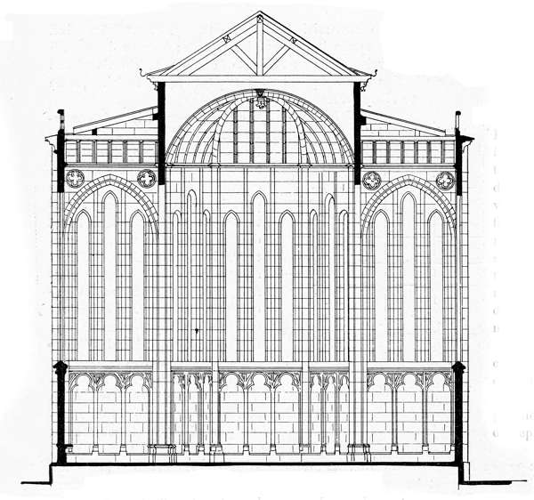 Le plan de l'église Sainte-Pauline du Vésinet est celui d'une église à nef centrale et à deux collatéraux. La nef est en berceau, soutenue par une pile gothique à quatre fûts accolés, et les collatéraux sont, eux aussi, traités en berceau, et clos par un système de claires-voies élancées, favorisant dans l'intérieur de l'édifice une abondante distribution de lumière. Derrière cette abside se greffe une partie plus basse, à usage de sacristie et de services divers. C'est sous cette annexe que prend jour la descente vers le sous-sol, descente adroitement arrangée en façade postérieure, suivant le dispositif d'un perron dont un seul rampant monte alors que l'autre est originalement remplacé par les gradins descendant au sous-sol. En ce sous-sol, une salle de catéchisme, une chaufferie et divers services. Le caractère de l'œuvre a une netteté d'allure qui, sans aucun doute, correspond à la franchise des procédés de construction. C'est là une démonstration excellente, et une fois de plus, du sage emploi d'une matière disciplinée elle-même et nettement conditionnée par l'aftectation qu'on lui donne.