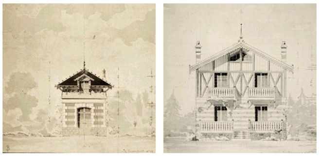 Constructions de Théophile Bourgeois pour Le Vésinet (La Villa moderne vol. 3) Pavillon de Concierge (planche 83) et Chalet au Vésinet (planche 16).