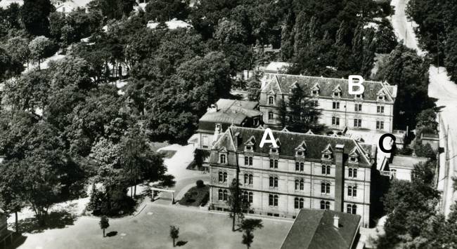 (A) bâtiment principal de l'école, en service jusqu'à sa démolition en 1976 ; (B) bâtiment désaffecté en raison de son état d'insécurité ;