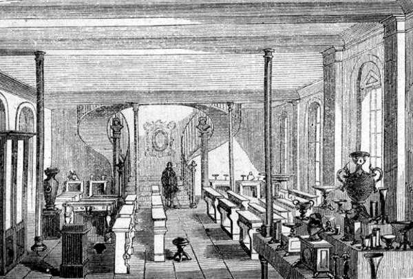 Des dessinateurs habiles puisent leurs renseignements aux meilleures sources et exécutent les nombreux modèles qui servent à la fabrication. La nécessité où l'on est de marier presque toujours le bronze au marbre, afin de multiplier les formes, les sujets et de copier les différents styles, a nécessité l'adjonction à l'usine des onyx, d'une fabrique de bronzes d'art. Usine Pallu (1861) — Le magazin d'exposition Le premier étage renferme la collection la plus variée de tous les gracieux chefs-d'œuvre qu'enfante cette artistique fabrication