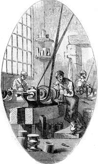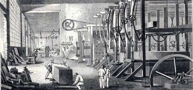 Usine Pallu (1861) - Cours, ateliers, machines génératrices de vapeur. Nous avons pris à l'usine de Paris les croquis qui accompagnent cet article. Un bâtiment important dont la façade monumentale se déploie sur la rue Popincourt [1], contient les magasins d'exposition.[2] Au rez-de-chaussée sont rangés les objets de grandes dimensions. Le premier étage renferme la collection la plus variée de tous les gracieux chefs-d'œuvre qu'enfante cette artistique fabrication. Usine Pallu (1861) – Grande scierie A cette salle succède l'atelier des tourneurs. Ceux-ci traitent le marbre comme on traite le fer dans les ateliers de mécanique. Plusieurs arbres de couche font mouvoir des tours à pointes, des tours en l'air à travail circulaire ou elliptique, des tours à percer et à fileter, des tours parallèles, etc. En face se développent sur toute la longueur de la cour les salles consacrées à la sculpture et au polissage. Un chantier fait suite à ces constructions c'est là que viennent s'entasser les marbres bruts à leur arrivée d'Algérie.