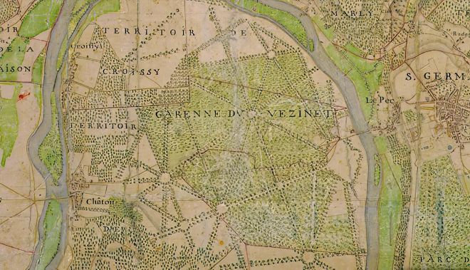 Les maisons royales et autres bâtiments de leur dépendance sont en plans couverts d'or La ligne jaune marque l'étendue du grand parc de Versailles Les lignes rouges entourent les territoires de chaque paroisse Version complète de la carte haute résolution [3 Mo] Archives départementales des Yvelines, Versailles (Yvelines, France) Référence (cote du document) A 43. Claude CARON (~1645-1700) est moins connu que son fils Pierre à qui l'on doit quelques plans et cartes de notre territoire. |