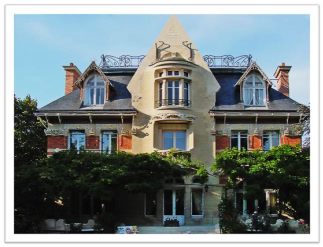La villa Berthe, facade postérieure © cliché SIDSV, 2011. Guimard se plaisait à traduire à l'extérieur les fonctions spécifiques des aménagements intérieurs et cela est très clair avec ses cages d'escalier marquées par des fenêtres en biais. Ce principe est esquissé au Castel Béranger mais il est ici plus élégant, avec cette taille en oblique des ouvertures qui constitue un bel exploit technique. *** Né en réaction contre la reproduction sclérosante des anciens styles -accentuée par l'industrialisation-, l'Art Nouveau est un mouvement soudain, rapide, qui connaît un développement international. S'il comporte des nuances selon les pays, ses critères sont communs : l'inventivité, la présence de rythmes, couleurs, ornementations inspirés des arbres, des fleurs, des insectes, des animaux, et qui introduisent du sensible dans le décor quotidien. Il sera cependant éphémère, de 1890 à 1910, pour évoluer ensuite vers le style plus géométrique de l'Art Déco.