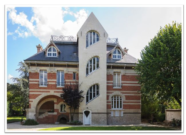 **** Notes et sources: [1] avec l'apport des résumés des visites guidées proposées par les propriétaires, l'été, sous la conduite d'étudiants en histoire de l'Art, dont Delphine Deshayes et Aude Thierry. [2] Inscrit à l'inventaire supplémentaire des monuments historiques (ISMH) par arrêté du 11 décembre 1979. Précision sur la protection : Façades et toitures, y compris les ferronneries du perron et de la clôture escalier intérieur avec sa rampe en bois plafonds décorés de deux des pièces du premier étage (cad. AB 113). [3] Benoit Caux, Les verrières de la nef et du chœur in Sainte Marguerite du Vésinet, une église à nulle autre pareille, Société d'Histoire du Vésinet, 2015.