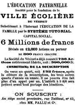 [4] La bibliothèque pédagogique de l’INRP a conservé une affiche sans date comportant une liste des personnes " qui ont bien voulu approuver et encourager la fondation de la ville écolière du Vésinet" .