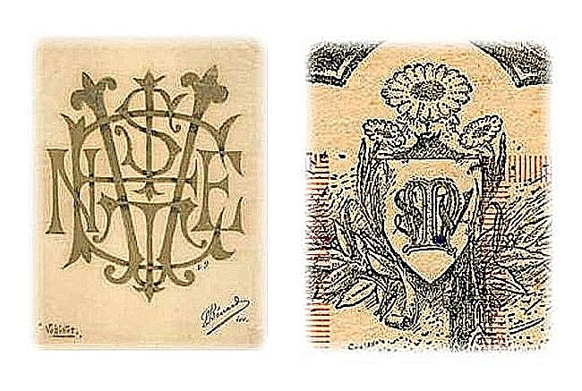 A gauche, ce monogramme daté de 1909, offert à la commune par Eugène Bénard en 1925, qui reprend toutes les lettres du mot VESINET, n'a semble-t-il jamais été utilisé. Un quart de siècle plus tard, Eugène Bénard soucieux de faire reconnaître sa contribution, écrivit au maire Camille Saulnier et y joignit le monogramme ci-dessus créé par lui en 1909. Il en autorisait la reproduction sous forme de « vignettes, peintures ou sculptures », à condition que ses initiales au moins y figurent. Cette lettre resta sans effet, comme d'autres adressées des années plus tard au maire Henri Cloppet. Cependant, un article de la Revue de l'Histoire de Versailles (1938) consacré aux armoiries des communes du département lui rendit justice en le reconnaissant comme le créateur des armoiries du Vésinet.