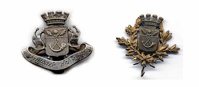 A gauche, épinglette frappée de la mention Amicale des A.E. L'amicale des anciens élèves était une des associations sportives du Vésinet, au début du XXe siècle, ancêtre de l'Union Sportive du Vésinet. Depuis 1898, les utilisations que l'on fit de ces armoiries sont innombrables. Parmi les plus anciennes (à droite), cet ancêtre de l'épinglette datant du début du XXe siècle, associé à une fonction officielle. On remarquera que le rameau de gauche est bien de feuilles de chêne alors que celui de droite est un rameau de lauriers.