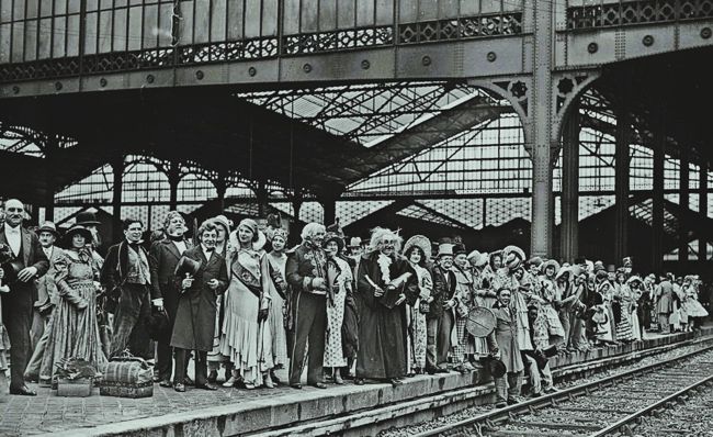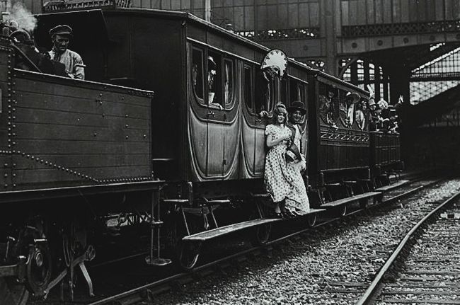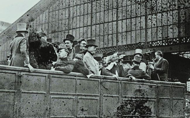 [2] Reconstitution du train Paris-Saint-Germain de 1837 à la gare Saint-Lazare, le 6 juillet 1930 avec des personnes en costumes d'époque. L'agence Rol (agence de presse) détentrice des clichés, était un des commanditaires de cet événement